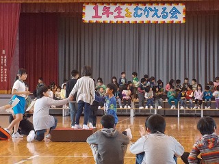 1年生を迎える会がありました。6年生と一緒に、手をつないでもらっての入場です。中央で名前を言ってリボンを掛けてもらいました。ステージ前のひな壇が1年生の定位置です。歓迎の歌やクイズがありました。また、ジャンケン列車で楽しく遊びました。1年生からも歌やお礼の言葉がありました。とても元気が良く、はきはきした1年生です。退場は6年生におんぶされて嬉しそうでした。しばらくの間は6年生がお世話をしてくれます。6年生のみなさん、ありがとうございます。